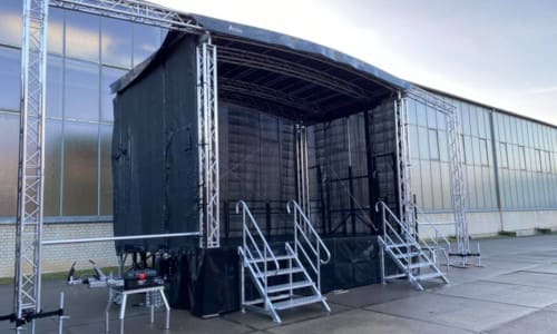 Unsere mobile Rundbogendach-Trailerbühne mit 24qm Gesamtfläche (Aufbauzeit nur ca. 30 Minuten) und die mobile Pultdach-Trailerbühne mit 48qm Gesamtfläche (Aufbauzeit nur ca. 45 Minuten).